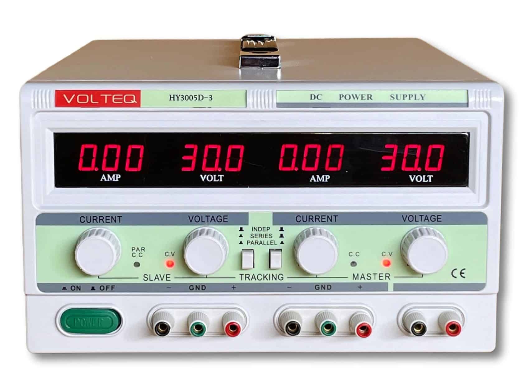 VOLTEQ HY3005D-3 is a triple output adjustable regulated power supply. This linear power supply has three outputs: two outputs are continuously adjustable at 0-30V DC and 0-5A, and the third output is fixed at 5V DC and 3A. What's more, the two outputs can be used either in independent, series or parallel mode, providing either two independent outputs, or one output with twice the voltage or twice the current output, up to 60V or 10A. The unit comes with 4 bright LED displays, providing accurate readout for the voltage and current value for both outputs. Comes with two connectors for series or parallel mode.